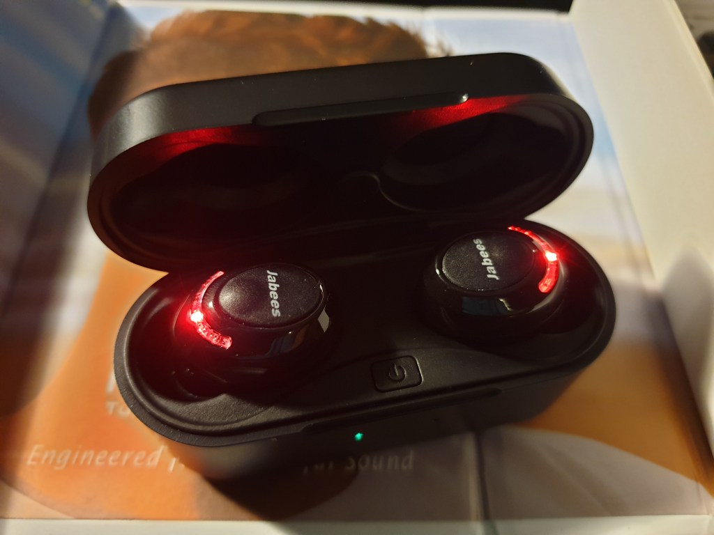 The Jabees come in a plastic rectangular charging case that is a tad bulky, with a similar girth to the Earfun Free – battery life is rated at an additional 18 hours on top of 6 hours of the earbuds. The earbuds snap on magnetically and remain securely in place. The plastic lid is a tad flimsy, but overall the case seems quite durable. There is a large power button in the case used only for doing a factory reset for the earbuds. Some odd quirks are the fact that it has 2 charging LEDs only light up turquoise and red when they are charging (see photo below), and you have no telling what the charging progress (green-yellow-red) is until the turquoise left light turns off or you stop charging. I am thus perplexed by why there is a red light on the right in the first place. This is not a huge issue on its own, but it would have been nice if the lights accurately reflected battery life while they were charging, both for the earbuds and the case. Additionally, the yellow light that denotes medium battery life from 25-75% still has a greenish tint, which can be confusing under certain conditions.